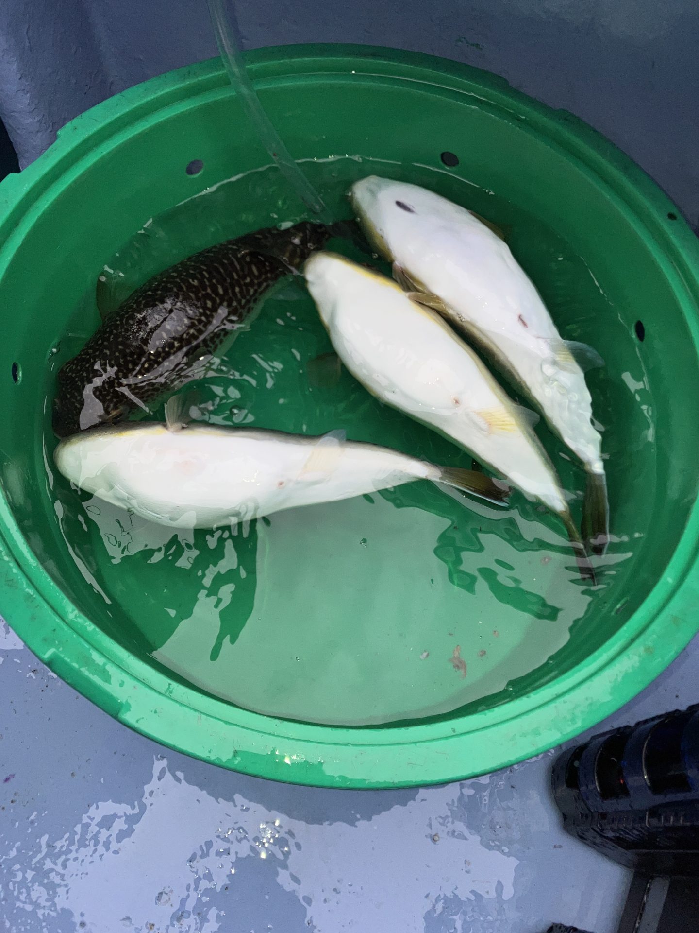 途中で中乗りさんがショウサイフグを捌いてくれる中、これは尾びれが黄色いからハイブリッドねと泣く泣く捨てられて残念!ハイブリッドは、尾びれが黄色く、お腹を膨らますと小さい棘があるのが特徴のようです。あきらめず最後まで頑張るも最終的には0から7と残念な結果に終ってしまいました。