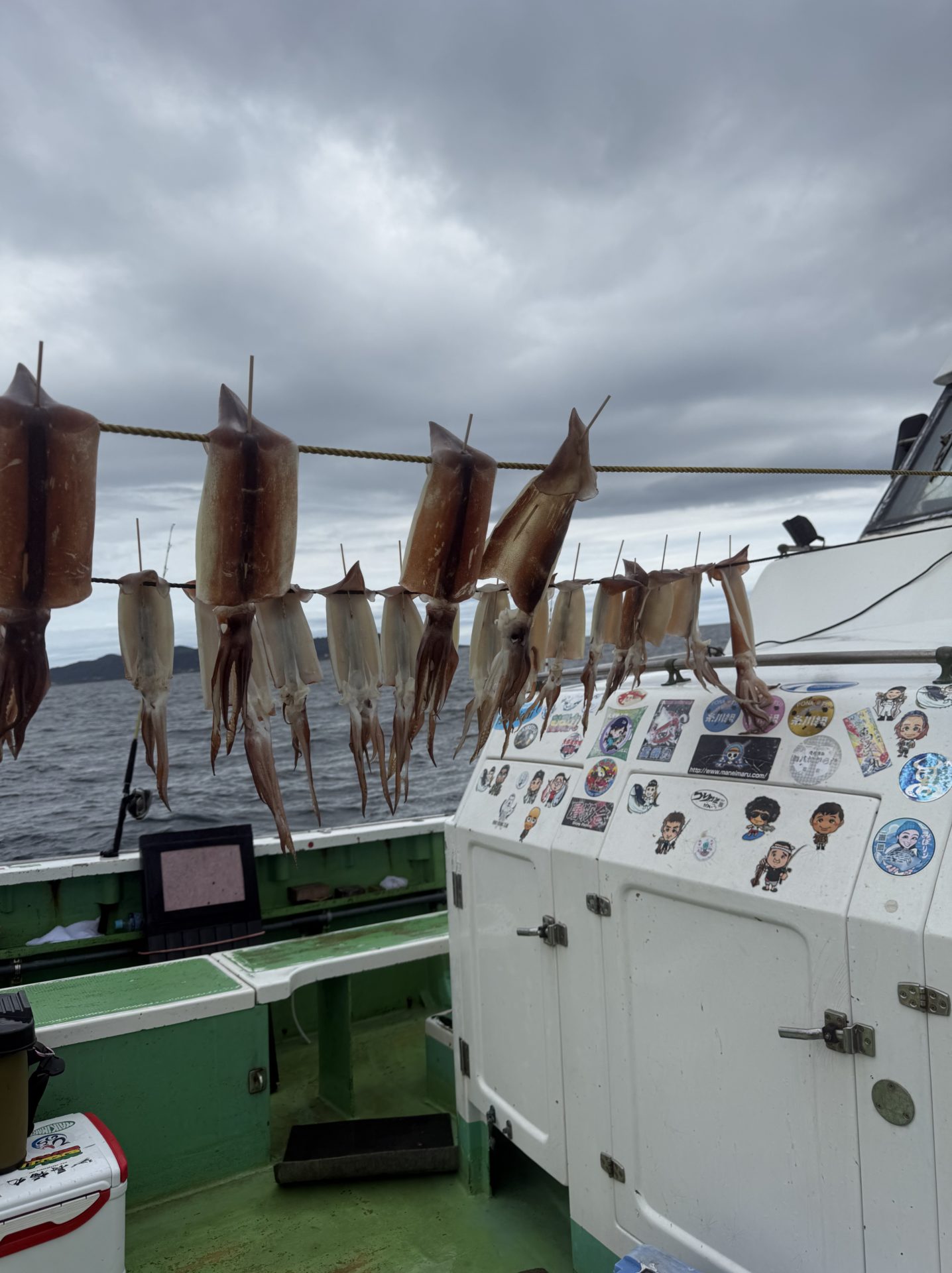 ある程度数がまとまったところで、「沖干し」の製作に取りかかりました。釣ったスルメイカを新鮮なうちに開き、海水で洗ってから船上で干すという、釣り人ならではの贅沢料理です。潮風で急速に乾燥させることで、旨みがギュッと凝縮され、独特の風味と食感が楽しめます。持ち帰ったイカは、塩辛にしたり、軽く炙ってビールのおつまみにしたり…まさに釣り人の特権料理です。