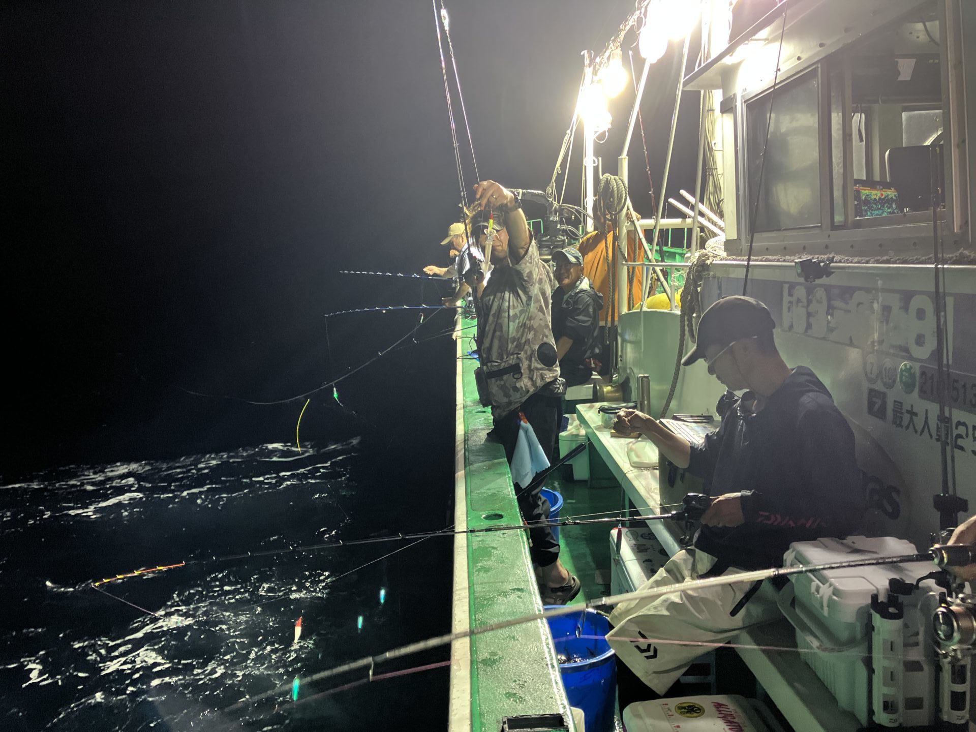 ケンサキイカからスジイカに変更した例会となりました。乗船時には船長から「中々厳しいかも」と脅されながらも予定通り17時半に出航し、約1時間かけて漁場に到着。