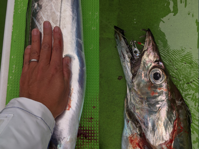 | 状況 | 今回は鹿島から日立沖の冬のデカタチウオのジギングを当初狙っていましたが、 年末までタチウオが来ずに延期の検討状態でした。 一旦は日立沖が好調になり日程を確定した直後にまた不調となり、 安定の走水沖でのタチウオへ直前に切り替えるという幽霊魚に振り回されるバタバタ企画となりました。 船宿は、よくお世話になっていた船橋内木丸の後継的な伊藤遊船。 タチウオはジグ、テンヤ、天秤好きなものをやって良いという自由なスタイルでした。 6:30集合とのんびりで、早く着いた人が黒板に名前を書くスタイルで幹事が早めに行って、 オオトモは取れなかったものの、ミヨシに固まって無事席も確保できました。 出船後走水沖までは1.5H程度走り、タチウオ船団の中で実釣開始です。 周りはすでに釣り上げている人が見えて期待大です。 天気は小雨まじりでしたが、潮は早くなく水深50〜70m程度でなかなか釣りやすい状態でした。 船内では、1m前後のいいタチウオが、天秤、ジグでよく釣れます。 ベルトは全然いないのがいいですね。時折ヤツの歯で高切れやリーダー切れでジグロストなどもありながら、 ワイヤーは釣果が半分くらいになると船頭に言われたので筆者はワイヤーは使わずにジグとテンヤで攻めました。 結果は船内TOP17本と大爆釣とまではいきませんでしたが、時折ドラゴンもまじり、 雨も小雨で寒くもなく、みんなそこそこお土産を確保して結果的にはいい釣行になりました。 | |