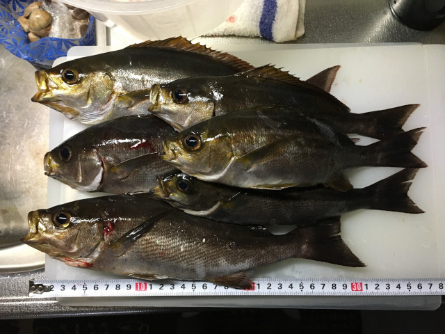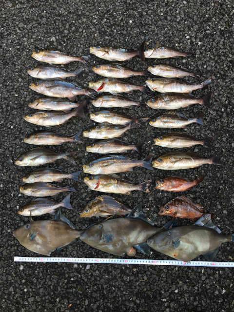 道糸 :PE 2〜4号。 ビシ :サニービシFL60号、天秤 :片テンビン30cm クッションゴム:1.5〜2mm 30cm 、仕掛け :ハリス 幹1.5号〜2号 (夏にかけてシマアジも混じることもあり3号も可) 枝1.5〜2号15cm〜25cm 針 :カラー針 ムツ9号 or チヌ2号(3本〜4本針)、 エサ :オキアミ(イカタン、イカベイト は 付きませんでした) |
