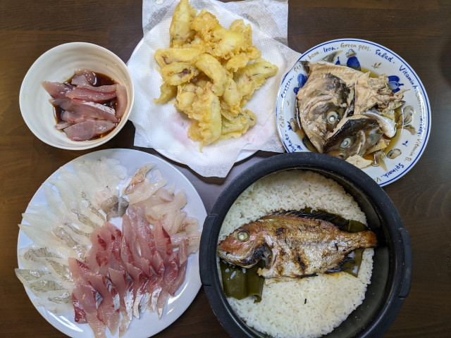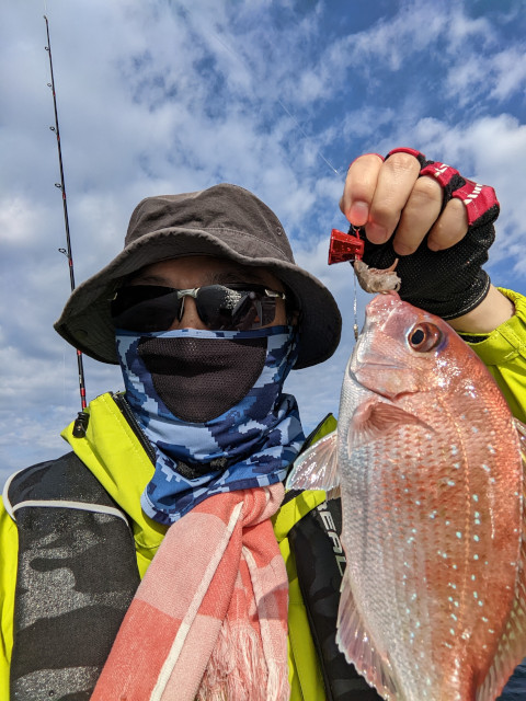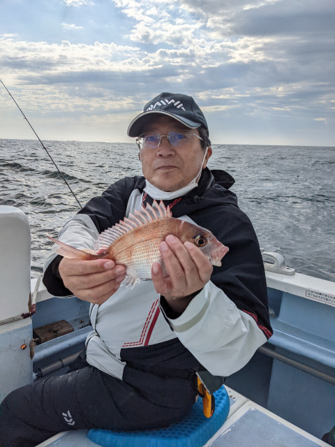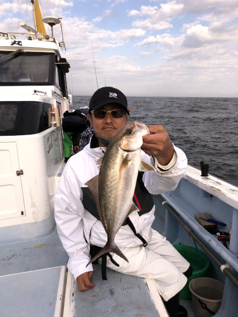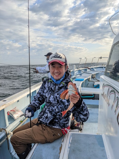 | 状況 | 期間限定の活きエビを餌にして春の乗っ込み大鯛を狙います。 前日の嵐で出船が危ぶまれましたが、皆さん気合充分で朝3時に港に集合し出船を待ちます。 4:30に予定通り出船するも、船長から港の外は波が高いとのアナウンスがあり、少し不安が、、、 前日からのうねりが残っている中、1時間弱で沖のポイントに到着。 朝のチャンスタイムでは、ホウボウ、マハタ、カンパチ、ムシガレイ、ハナダイの外道に混じり、 ポツポツと小型ですが本命の真鯛が上がります。 先週までの好調から一転、かなり渋い状況。やはり前日の嵐が影響しているみたいです。 一向に真鯛の活性が上がらないため、ターゲットをカンパチに切り替え沖の沈船周りを攻めると、 30〜40cm程度のカンパチがまさに入れ食いで、皆さんお土産をゲットできました。 本命の真鯛は小型で数も少なかったので少々消化不良の釣行でしたが、カンパチを筆頭として多彩なゲストが楽しませてくれた例会になりました。 | |