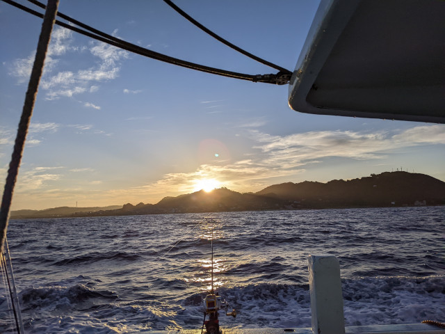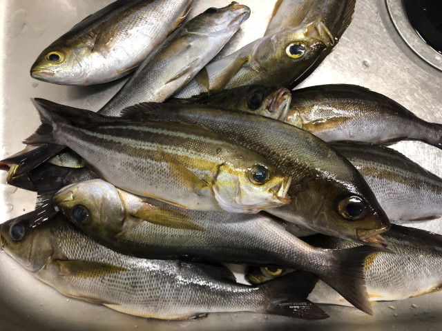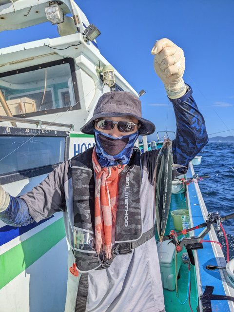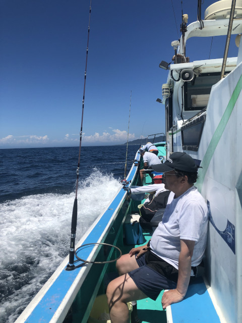 | 状況 | 猛暑の中、シマアジを求めて南房総への合宿釣行でした。 前日に船宿常連さんから、ハリスの太さは関係なく8〜10号でもよいくらいだが、 シマアジの後ろにサメが泳いでいて、かかるとすぐにサメがシマアジを丸ごと食べてしまうらしいので、 幸運にもシマアジがかかっても、サメ地獄に陥って、手に入れるのは難しいそう。 当日は、皆さんシマアジ狙いで太めの仕掛けで挑戦しましたが、案の定、ぐんとかかったら、 ぶちーんとハリスが切られる事態が続出。小さいイサキは、いくらでもかかりました。 イサキを手繰っていると1mくらいのサメが追っかけていました。これじゃあ難しいって感じ。 気分を変えて8時すぎに、沖へ根魚を狙いに行ったが、潮が早くてなかなか辛く、カサゴ系が数匹ぽつぽつ状態。 とにかく猛暑でたまらず、再びシマアジポイントへ戻ってイサキでも狙いました。 左前で大きなアタリあって、シマアジが目の前のところでラインブレイク。太めの仕掛けにしておけばGETできたかも・・・ なかなか、難しい釣りでしたが、夢がある釣りでした。帰ってイサキ塩焼きをおいしくいただきました。 | |