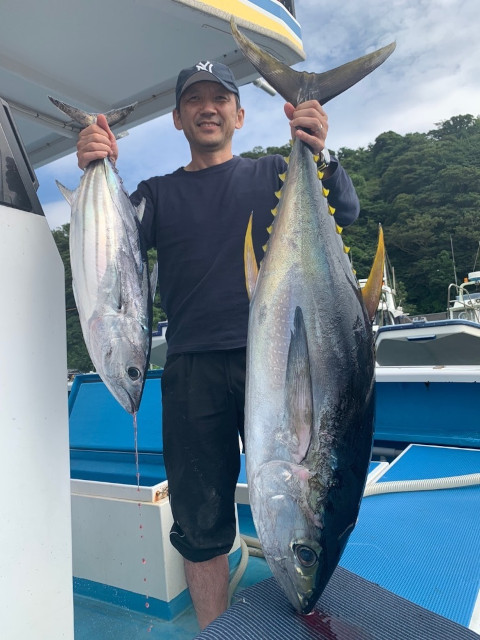 | 状況 | 今回は初の東地区でのマグロ企画を、萬栄丸さんで企画しました。 どうやら連日の釣果は絶好調で、7/31には今期累計400本を達成したとのことです。 6月の西企画につづき、利島近辺でのマグロふかせ釣りを行いました。 当日の天気は曇り。真夏の釣行としてまずまずのコンディション。午前5時を待たずに出航です。 まずは、館山湾でイワシの調達をし、一路、利島まで3時間の船旅です。 開始早々、いたるところで「来たぞ〜!」と威勢のいい声が! いつもの魚と比べると段違いの引きに、みんな「やばいっ」て顔になってます。 途中、引っこ抜けた方も出てくれば、痛恨のハリス切れなどバラシの連続。 そのような中、15分からMax40分ほどの激闘を制して、何とか船中5本の釣果となりました。 連日のマグロ祭りは少しお休みだったようです。 みなさん、美味しい脂たっぷりカツオのお土産を持って帰路につきました。 ※6月のキハダより8月のキハダの方が格段に美味かったです! | |