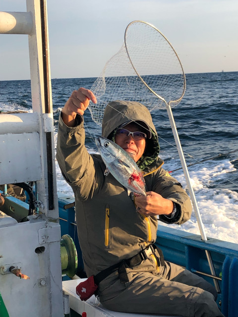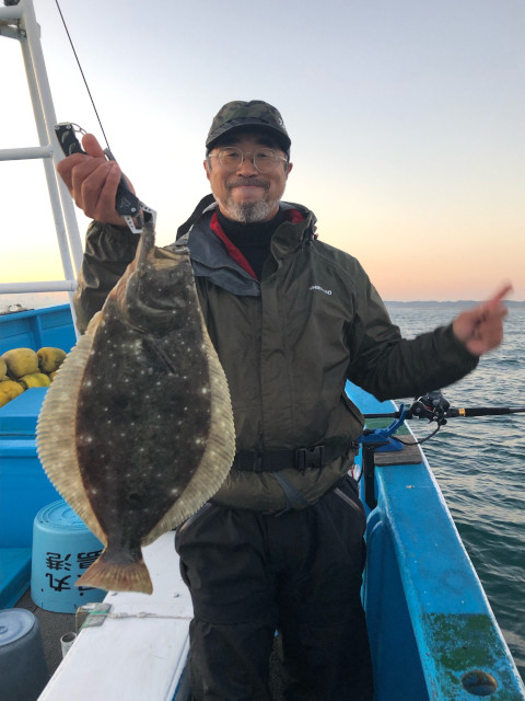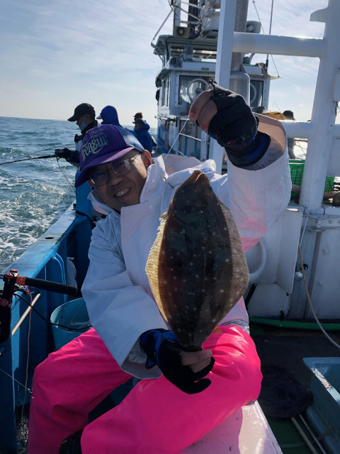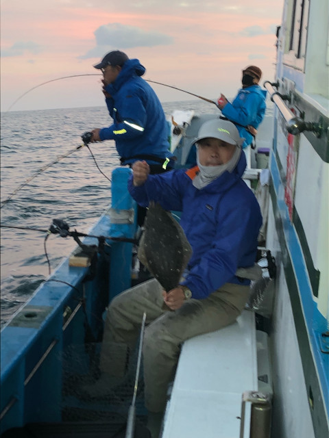 | 状況 | 11月に解禁となった鹿島沖でのヒラメ釣行に出発。 朝は風も弱く、天気は快晴。予定通り4時半には全員集合し、まだ日の出前の暗い港を5時過ぎ出船。 ミヨシから右4名、左3名の釣座に分かれ、出船後10分ほどで釣りを開始。 右舷で早速1枚目のヒラメが上がりました。なんと、捨て糸の長さはゼロ?!でした。 鹿嶋アントラーズの本拠地であるカシマサッカースタジアム沖に移動した頃、 だんだん風も強くなり、海にもうねりが出てきて船の上下が大きくなり、 釣りにくくなってきましたが、左舷で60cmを超える大ヒラメがあがり、 船上にもやる気が溢れてきました。 その後、「青物やー」という部員の声に、船長から「マグロやぁ、メジマグロ」と嬉しい外道も釣れました。 美味しそうなカンパチも釣れていました。 10時半には強風と生き餌のイワシがなくなってしまい、早上がりでしたが、 結果7名中4名がヒラメ6枚を釣れ、オデコ無しの例会となりました。 | |