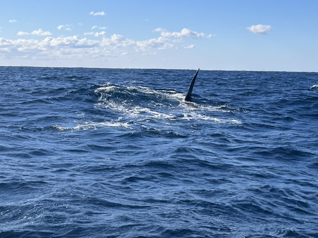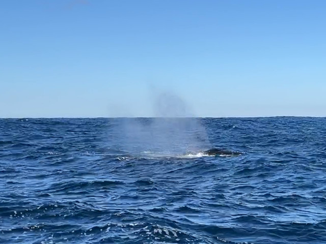 しかし、中々釣果につながらない状況となったため深場(水深:300m)に移動。 移動すると、船のまぢかでクジラに遭遇しました。 クジラは潮吹きや水面におおきく顔やヒレを出す場面などクジラのパフォーマンスを見ながら釣りを継続。 クジラに魚が食べられているせいか?なかなか本命は釣れません。 風は収まってきましたが潮悪く、サメの邪魔もおおく厳しい釣行となりました。 結果、アカムツ船中2匹、外道にクロムツ、キンメダイ、ユメカサゴなどが釣れました。 漁港にもどり、お昼のお稲荷さんとかへいや(カレーボール)を頂き、解散しました。 お疲れ様でした |