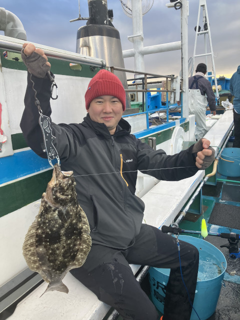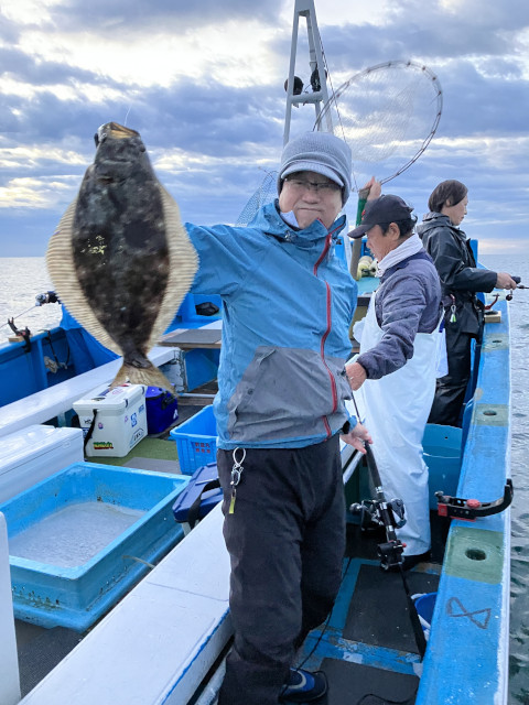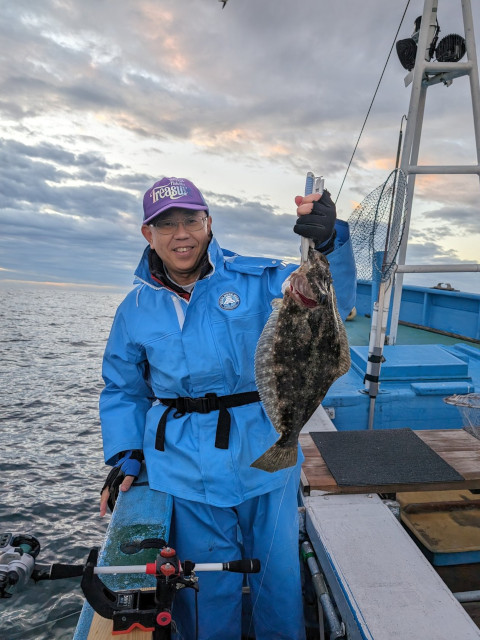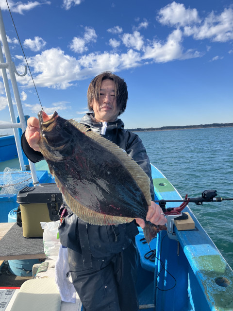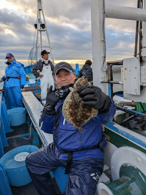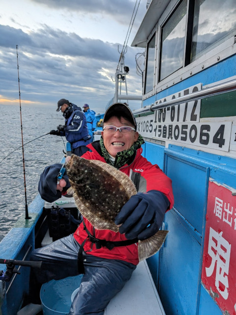 | 状況 | 釣行の1週間前から関東地方は暴風予報がTVでも騒がれていました。 前日に船宿に電話したところ、「南風だから大丈夫だと思うが、漁協が港を全面封鎖するかも」と脅される中、 リスク覚悟のわが釣り部有志一同は鹿島新港に集結しました。 港に着くと、風はなく、星も出ているという状況。。。 あれ?あれ?と思いながら、港に停泊する船に向かうと、すでに船長も女将さんも到着し、 餌のイワシを船に積んでいるところ、「イワシを積んだからすぐに出れるよ、準備して」とせかされますが、 いつも集合時間1時間前には集まっている釣り部員がまだ到着していません。 皆さん、リスクがあるのでギリギリに来ようとしていたのか、予定の集合時間には全員がそろい、出船となりました。 港から外海に出るまでが少しうねっていましたが、外海にでてからは風も波もなく、 天気も良いという絶好の釣り日和となりました。 釣り開始早々に本命のヒラメが上がり、船内は盛り上がってきました。 鹿島沖の浅場から始まり、北に30分ほど走り、少し深い釣り場を転々として、流すたびに釣れるという状況が続き、 結果、全員がヒラメを釣り上げることができ、オデコは無しという最高の釣果でした。 大型ヒラメも多くあがり、参加された皆さんの笑顔を見ることができ、お土産には釜揚げシラスもいただき、 リスク覚悟での今回の例会でしたが、大成功に終わることが出来ました。 | |