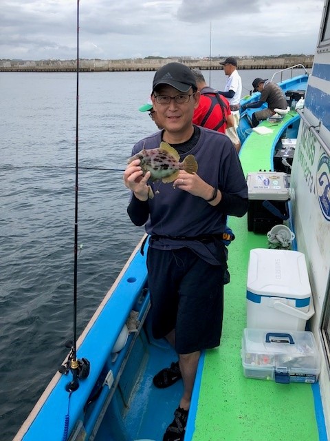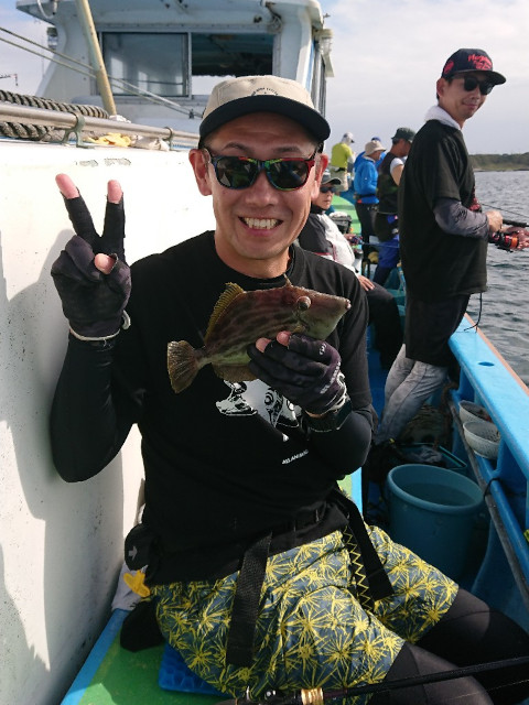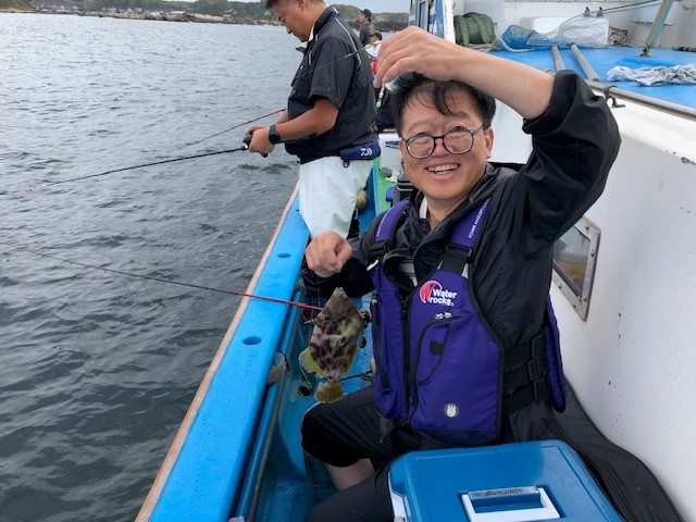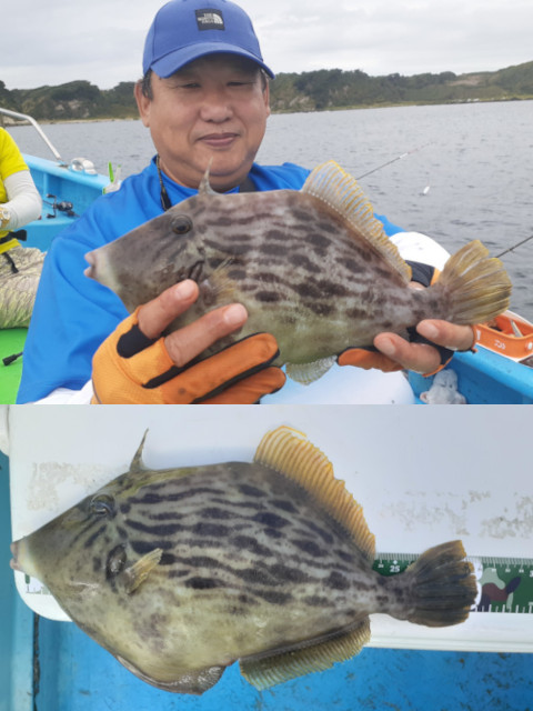 | 状況 | ちょうど剣崎沖でワラサ釣りが始まったことにより、瀬戸丸の配船都合で僚船の伝五郎丸での釣行となりました。 瀬戸丸と比較すると若干小さ目な伝五郎丸に乗り込み、ワラサ船が出船した後の6:30に出港。 港を出たすぐ前からスタートし、その後に剣崎沖〜松輪港前〜宮川港前と小移動をしながら釣りをする状況でした。 ぽつりぽつりと揚がるものの、場所によっては潮が早く、投入直後に仕掛け回収アナウンスが出るなど、 思うような展開にならないため、城ケ崎に移動して状況打開を図るも状況変わらず。。。 再び松輪港前〜宮川港前を流す展開に戻り、タイムアップ。 型は31センチ尺ハギを頭に20センチオーバーが多数混じる状況でしたが、 数については竿頭が9枚、坊主も出る厳しい釣行でした。ただ、9月入部の方も7枚ゲットする楽しい例会となりました。 参加された皆さん、お疲れ様でした! | |