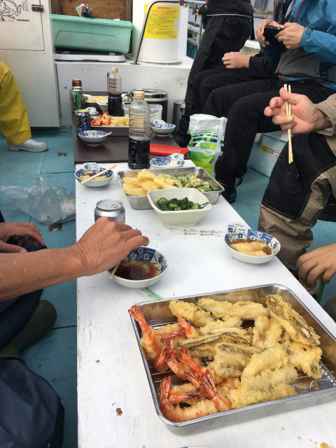 | J 左舷の釣り風景3 | K 船上で天ぷら昼食1 | |