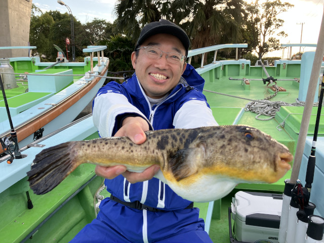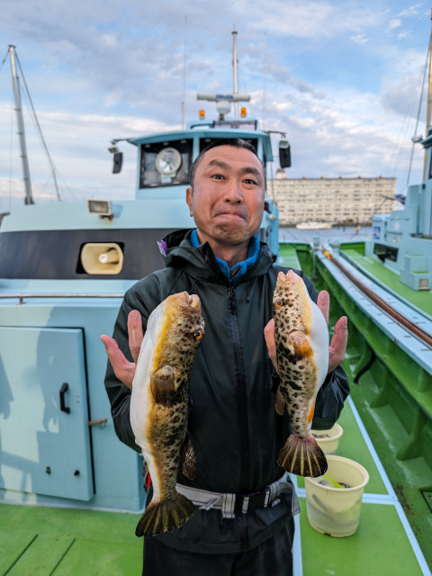 | 状況 | 週間天気予報では週末に風速10m以上の強風予想が続き、開催が危ぶまれていましたが、前日の船宿確認では 問題ないということで、無事に出船できることになりました。 当日は、天気予報によりキャンセルも多かったのか、当初は乗り合い1隻ということで案内されましたが、 2隻で出船することになり、釣り部メンバー以外は2名というほぼ仕立て状態となりました。 気にしていた風は、朝一に吹いている風が止まり、天気予報は何だったのかと感じる凪の時間が 1時間くらいありましたが、その後は南からの強風が吹き続けた1日となりました。 釣果は皆さん本命のフグをゲットし、トップは12匹という爆釣では無かったですが、大きなアカメフグ、 ショウサイフグ、コモンフグをゲットできました(ハイブリッドフグ(トラフグと他フグの子)も釣れましたが毒の部位が不明なので持ち帰れず)。 また外道にマダイ、カサゴ、イシモチ、ウミヘビ、エイ、ヒトデなどが釣れました♪ 風で大変でしたが、持ち帰ったフグを寝かせて、美味しく頂けました。 来年も美味しいフグを釣りましょう! | |